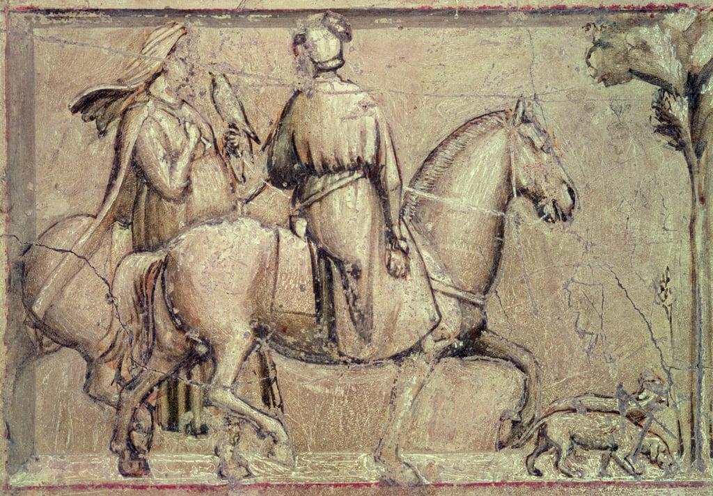 Allegory of Justice, before restoration (detail of two horsemen departing for the hunt with a falcon