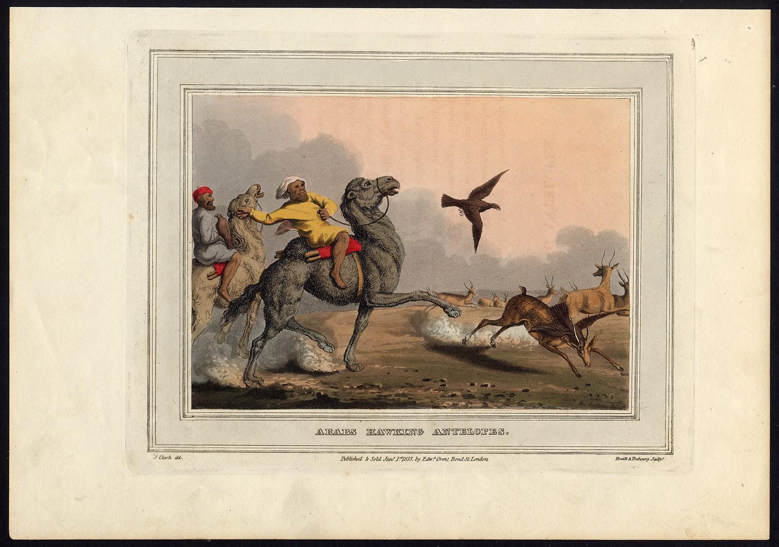 Antique Master Print-HUNTING-CAMEL-ANTELOPE-FALCONRY-Hewitt & Dubourg-Clark-1813