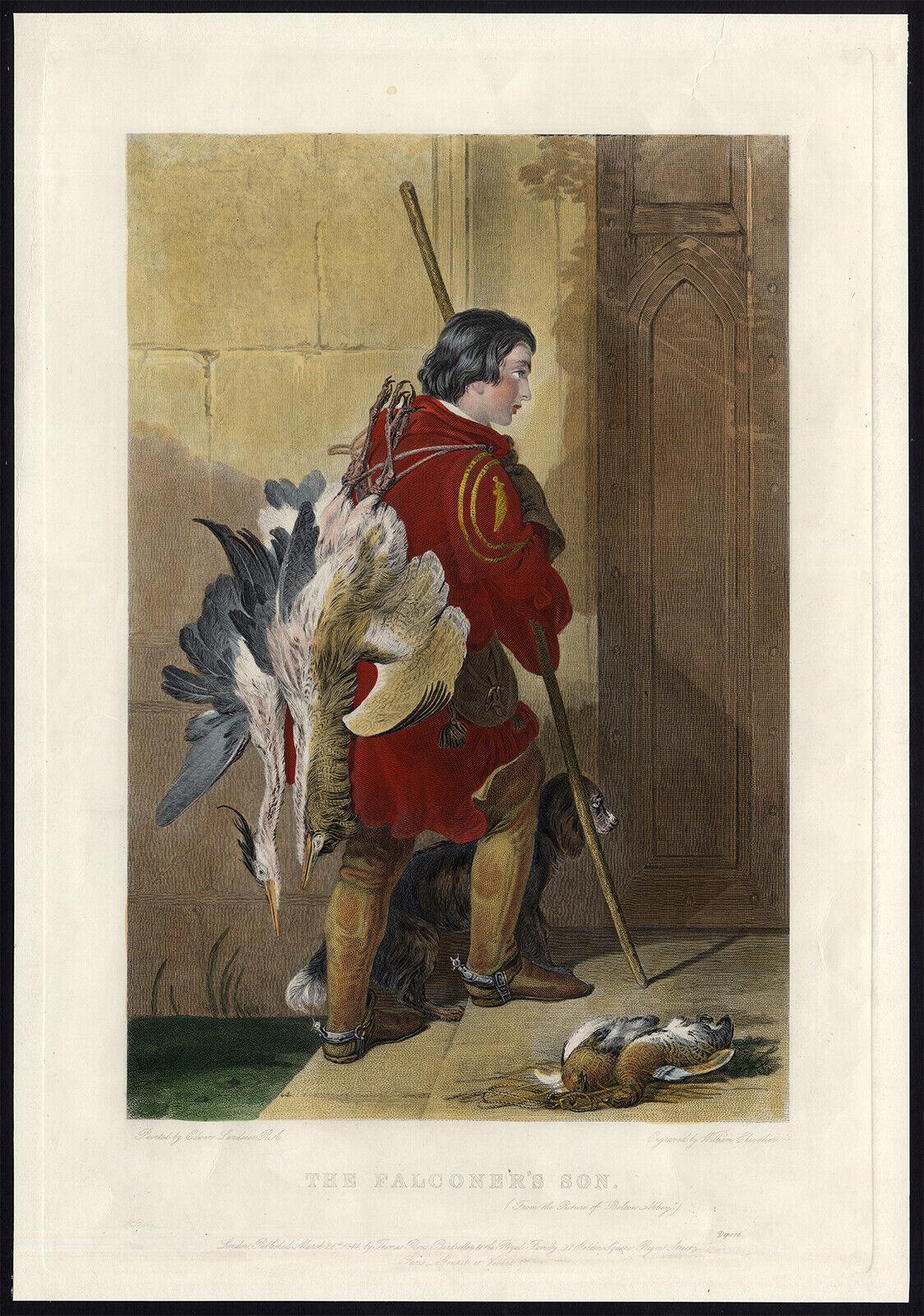 Antique Master Print-FALCONER-HERON-PARTRIDGE-FALCONRY-Chevalier-Landseer-1844