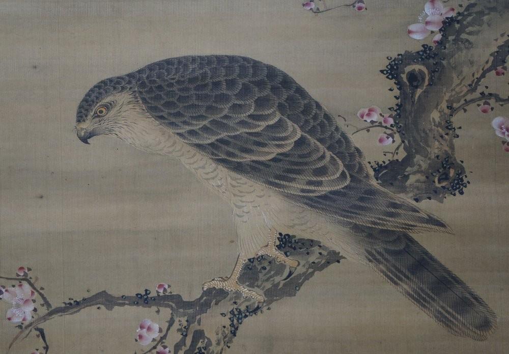 Antique Japan falconry painting Ume-Taka 1700s Edo Tadashi Kiyasu art