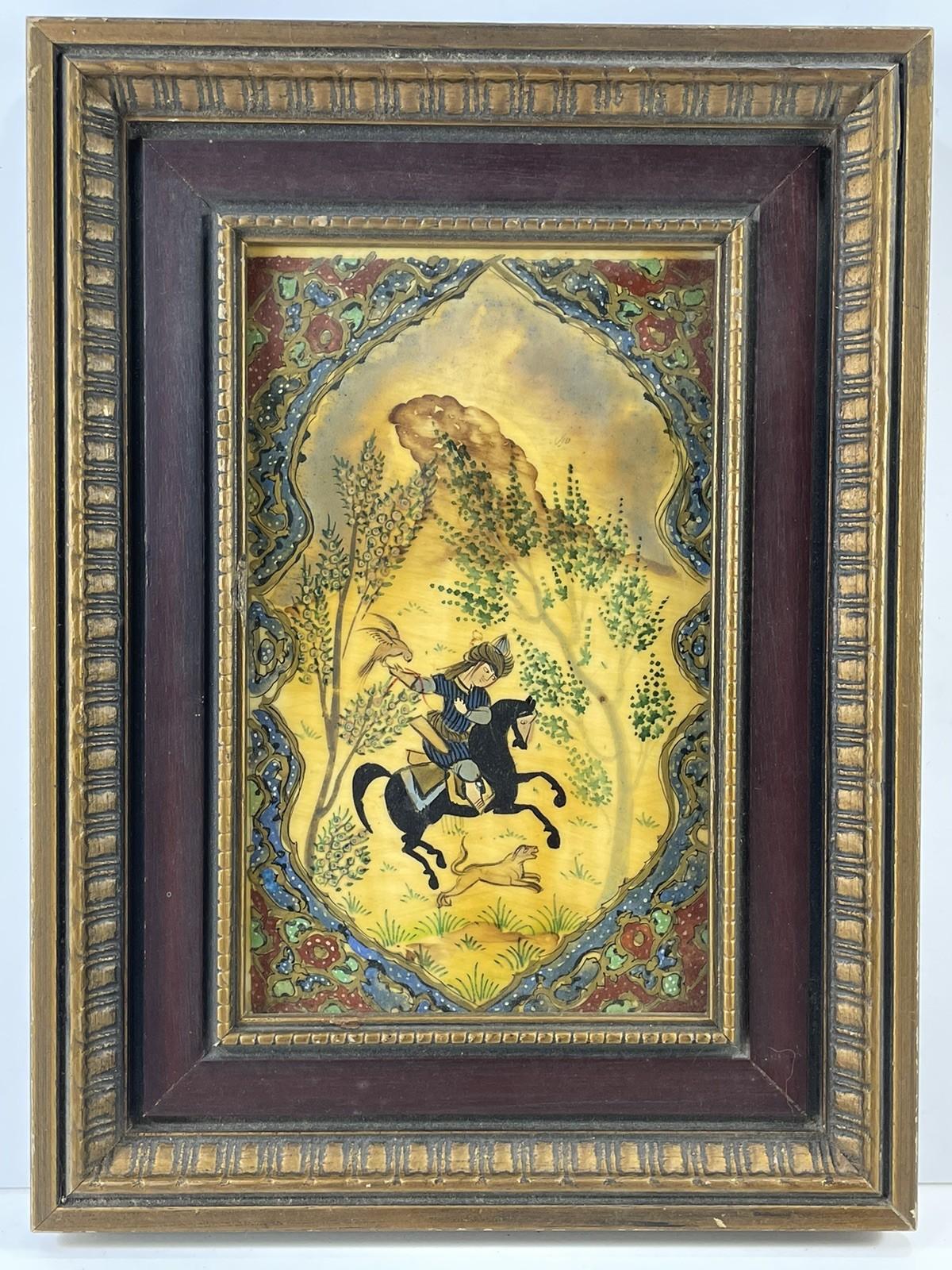 Antique Persian Miniature Oil Painting Celluloid Horse Falcon Dog Hunting FRAMED