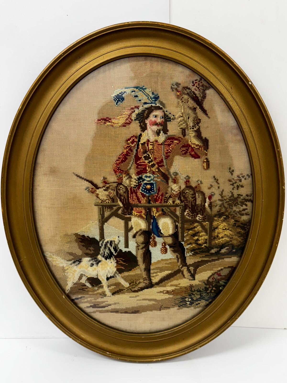 Antique Needlework Embroidery Picture Framed Falconer 19th century