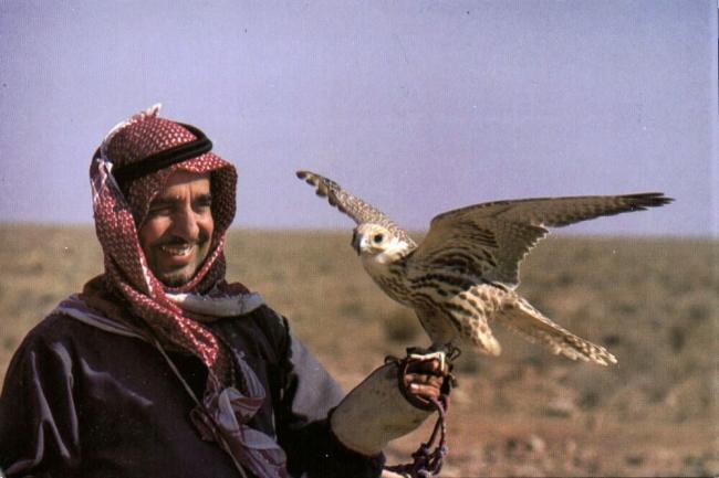Bahraini falconer of the 1970s on the postcard printed in Singapore