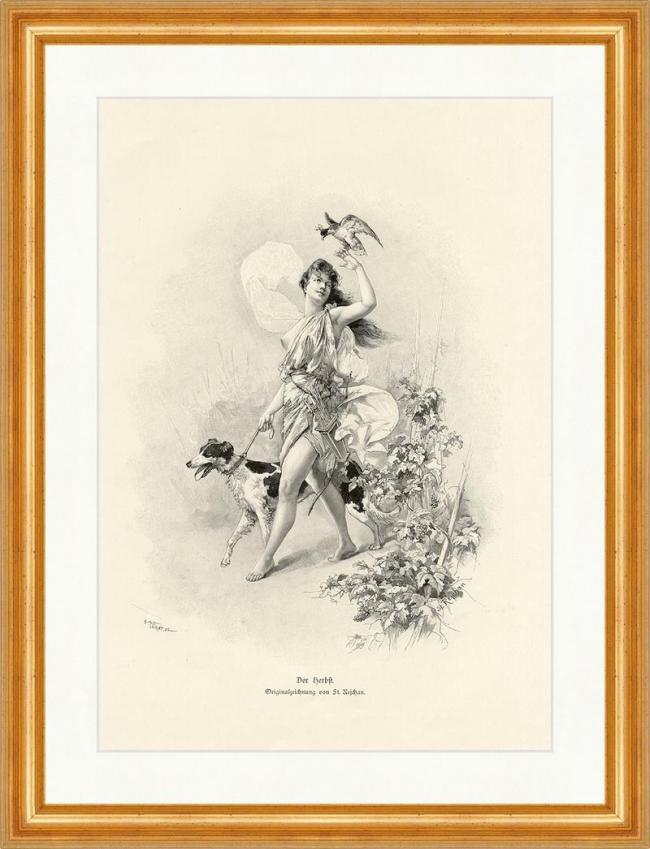 Der Herbst St. Rejchan Vogel Hund Pfeile Falknerin Falke Tiere Holzstich A 0795