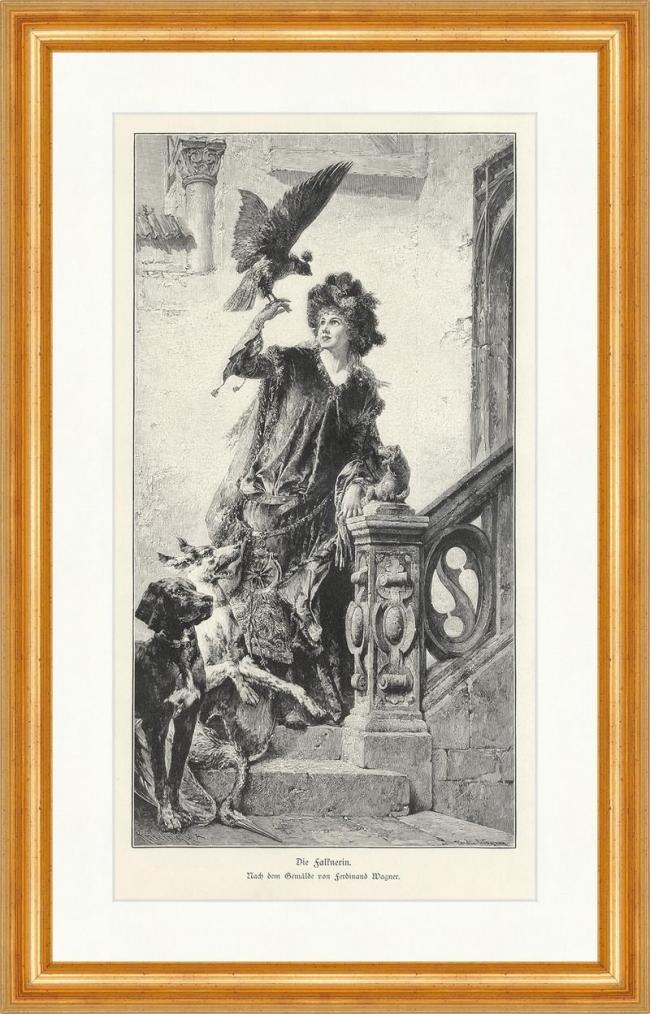 Die Falknerin Ferdinand Wagner Vogel Treppe Hunde Tiere Beute Holzstich A 0013