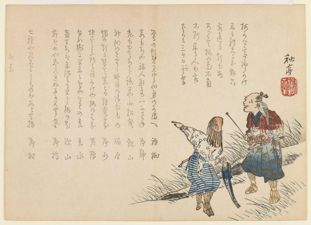 Falconer and Fisherman, 1855 (woodblock print) by Shûtei Tanaka (1810-1858)