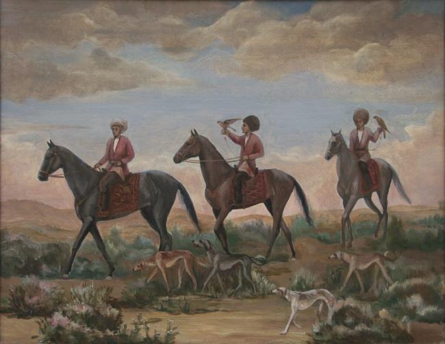 "Sunset Hunting" oil painting by Nikolay Didenko. Falconry with a hound Tazy.