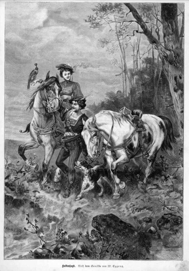 Falkner, Falknerin, Beizjagd, Falkenjagd, Original-Holzstich von ca. 1890
