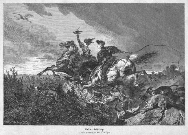 Falkneri, Falknerin, Beizjagd, Reiherbeize, Original-Holzstich von ca. 1890