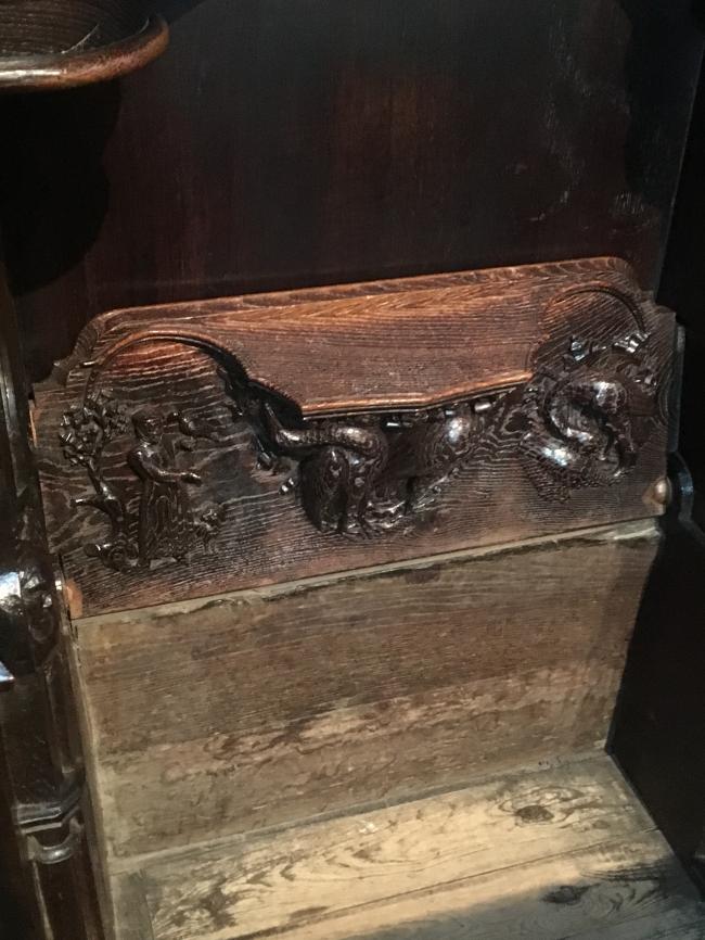 Wooden carvings of a falconer at the Lincoln cathedral in the UK